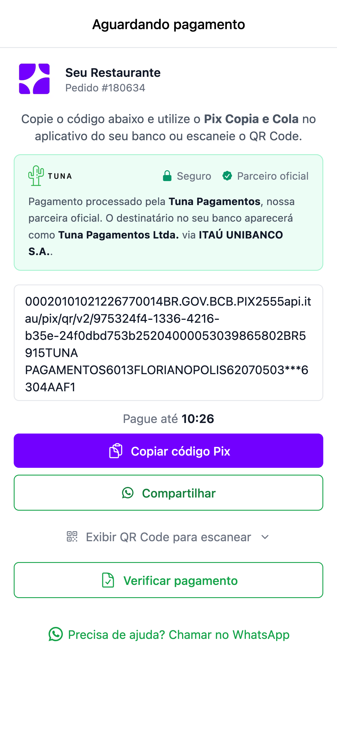 &#x20; Agora o cliente vê o código PIX completo em um campo fácil de selecionar (Copiar e Colar), com um botão para compartilhar diretamente no WhatsApp. O QR Code foi movido para uma seção colapsável, priorizando o fluxo rápido no mobile. *Cliente: Moochacho - Trindade*\