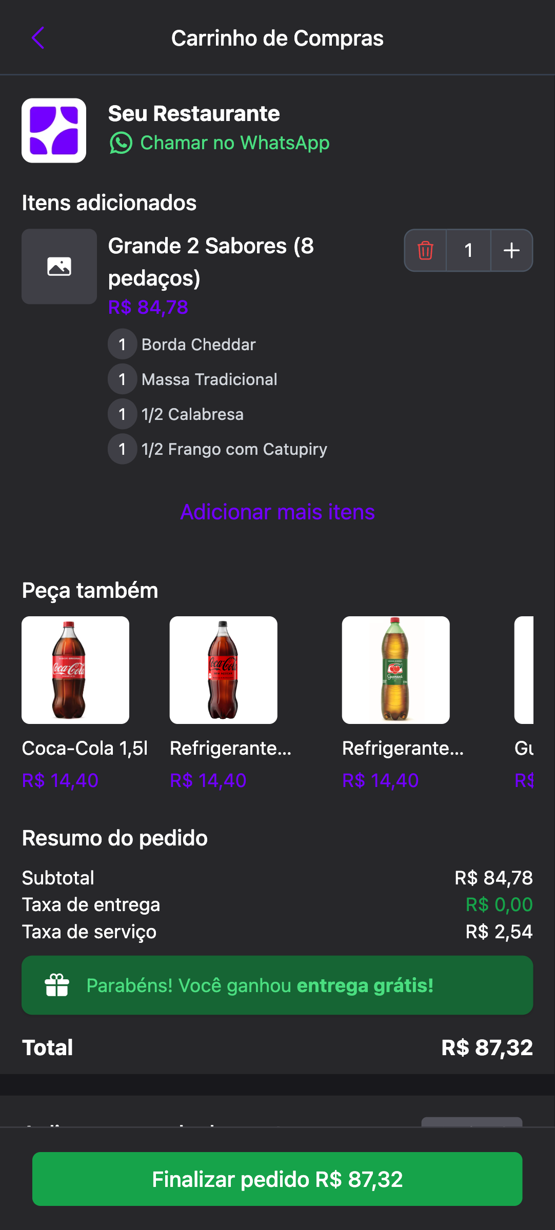 &#x20; O cliente pode aumentar ou diminuir a quantidade dos itens no carrinho sem precisar voltar para o cardápio. Quando a quantidade chega a 1, o botão de diminuir vira uma lixeira com confirmação antes de excluir o item.\