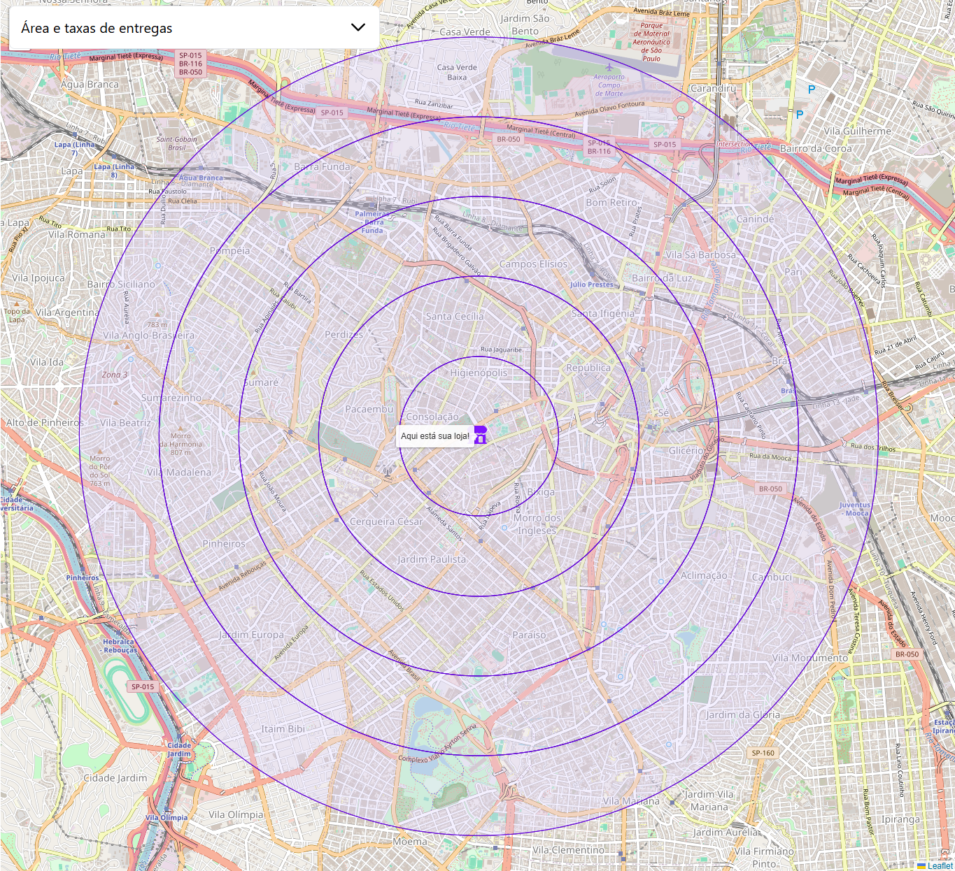 3️⃣ Após adicionar as áreas de entrega e clicar em <mark style="color:purple;">**Salvar**</mark>, o sistema irá exibir no <mark style="color:purple;">**mapa interativo**</mark> <mark style="color:purple;"></mark><mark style="color:purple;">o</mark> <mark style="color:purple;"></mark><mark style="color:purple;">**raio de cada uma das áreas cadastradas**</mark><mark style="color:purple;">,</mark> permitindo uma visualização clara da sua cobertura de atendimento.