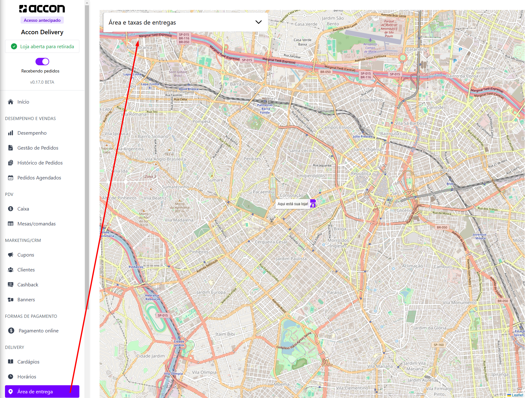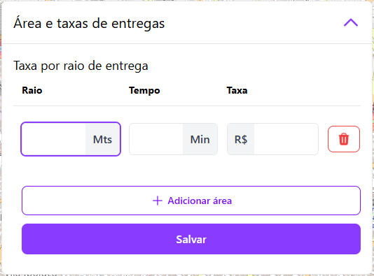 Agora, com a <mark style="color:purple;">**Área de Entrega**</mark>, você tem total controle sobre as suas entregas! Configure o <mark style="color:purple;">**raio de atendimento**</mark> da sua loja, defina o <mark style="color:purple;">**tempo estimado de entrega**</mark> e ajuste a <mark style="color:purple;">**taxa de entrega**</mark> de acordo com a sua necessidade.