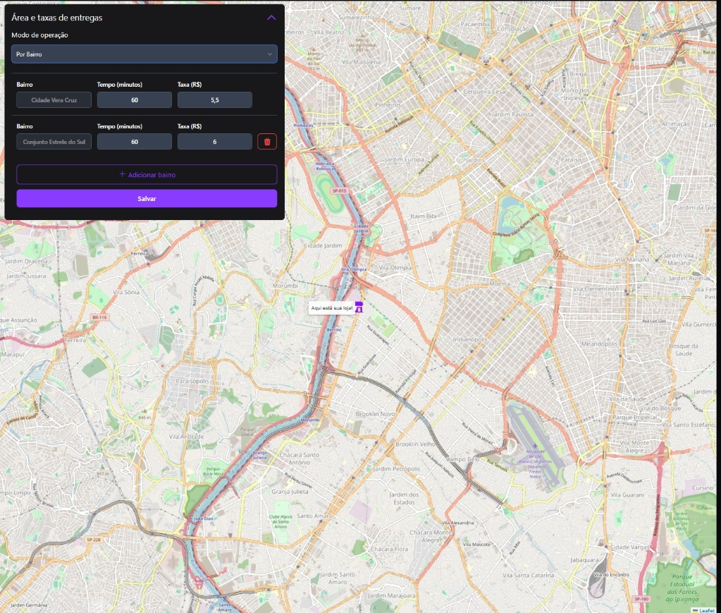 Nesta configuração, o restaurante pode definir manualmente bairros específicos que serão atendidos, atribuindo regras personalizadas de entrega para cada localidade.
