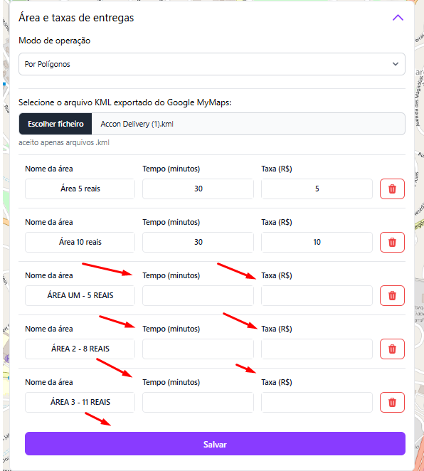 Ao finalizar, dê um nome à área e informe o valor da taxa de entrega correspondente.