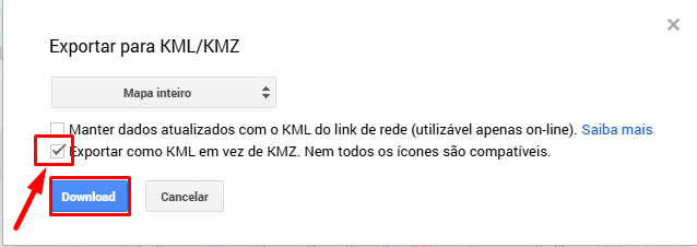 Escolha a opção “Exportar como KML” (não selecione KMZ).