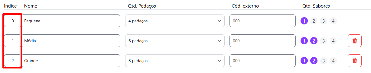 E no ultimo campo, temos a <mark style="color:purple;">**Qtd. Sabores.**</mark> Nessa campo é onde você determina se a pizza é meio ao meio, por exemplo. O sistema já faz o cálculo automático de acordo com a quantidade que o cliente selecionar.&#x20;