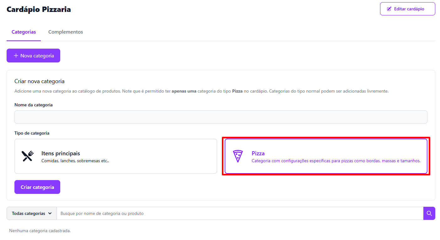 *<mark style="background-color:purple;">Lembrando que a só é possível criar</mark> <mark style="background-color:purple;"></mark><mark style="background-color:purple;">**uma categoria de pizza por cardápio**</mark><mark style="background-color:purple;">, as demais categorias você pode cadastrar livremente.</mark>*&#x20;