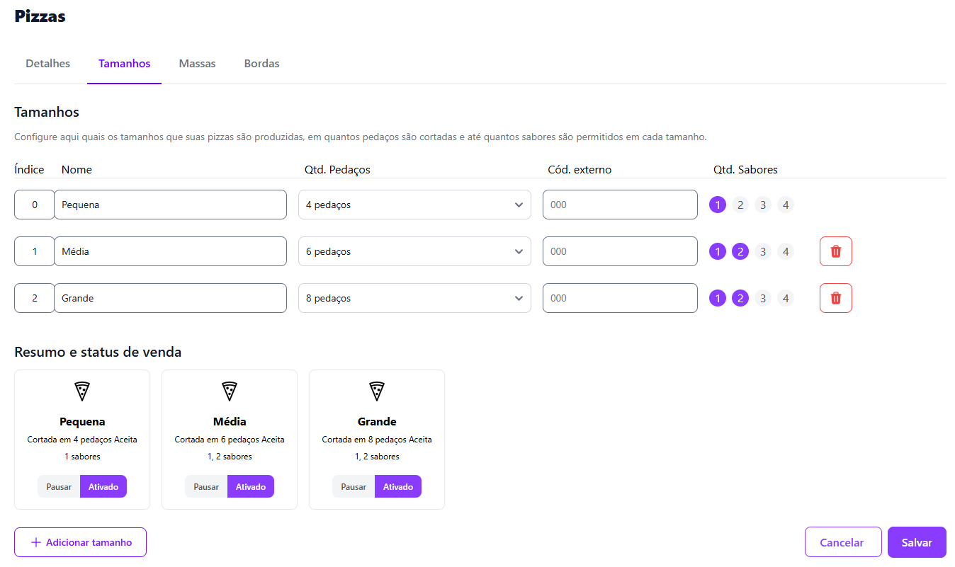 Na aba de Tamanhos, vão ser configurados quantos tamanhos de pizza você possui disponivel na sua loja e até quantos sabores são aceitos em cada.&#x20;