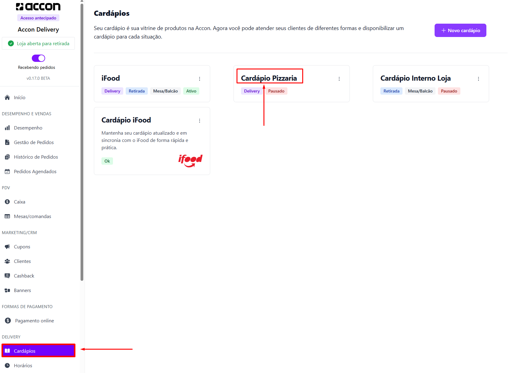 * Acesse o menu <mark style="color:purple;">**Cardápios**</mark> e selecione qual cardápio você quer editar clicando no nome dele.&#x20;