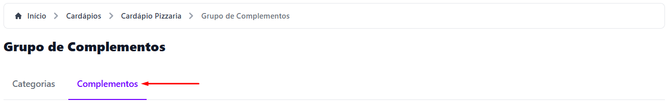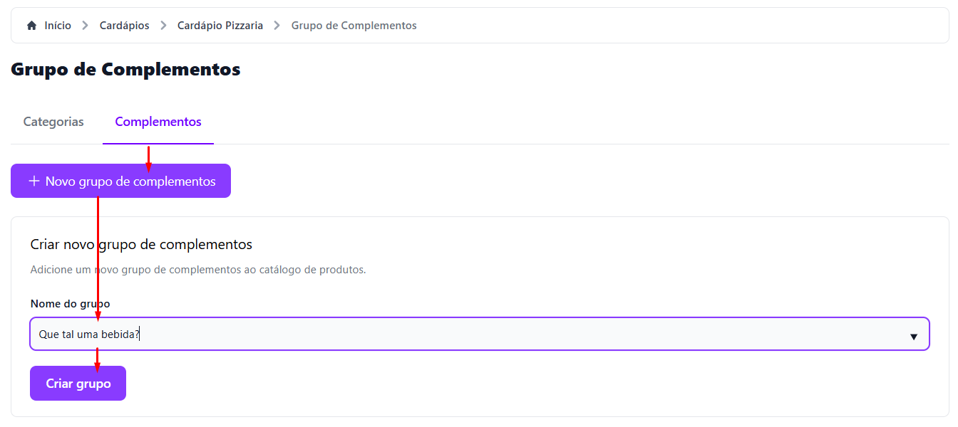 3. Clique em <mark style="color:purple;">**+ Novo grupo de complementos**</mark><mark style="color:purple;">.</mark>