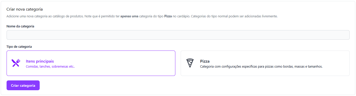 Caso o seu estabelecimento for uma pizzaria basta criar a categoria e seguir para o próximo passo: