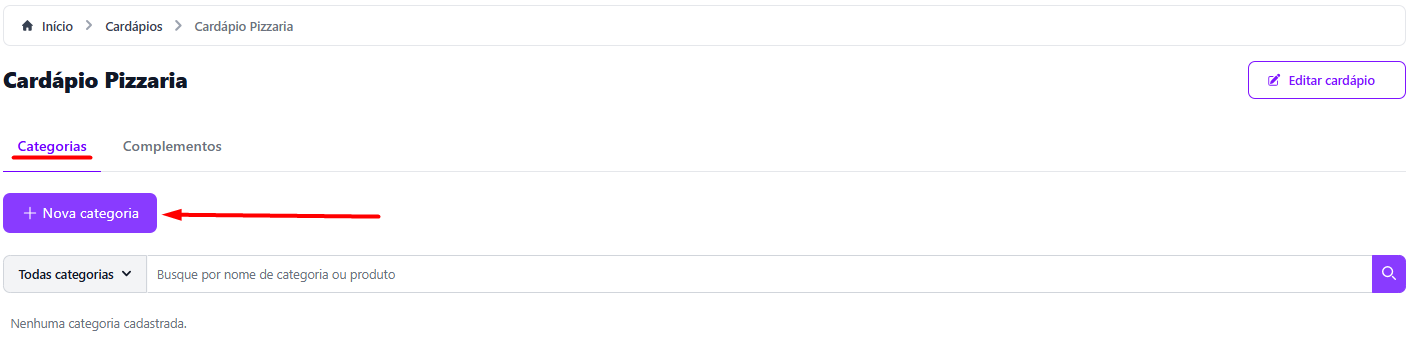 Acessando o cardápio dentro de Categorias, clique em + Nova categoria