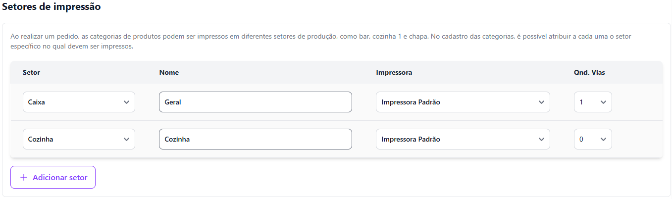* Se houver necessidade de adicionar outros setores além do Caixa e da Cozinha, clique em <mark style="color:purple;">**+ Adicionar Setor**</mark><mark style="color:purple;">.</mark>