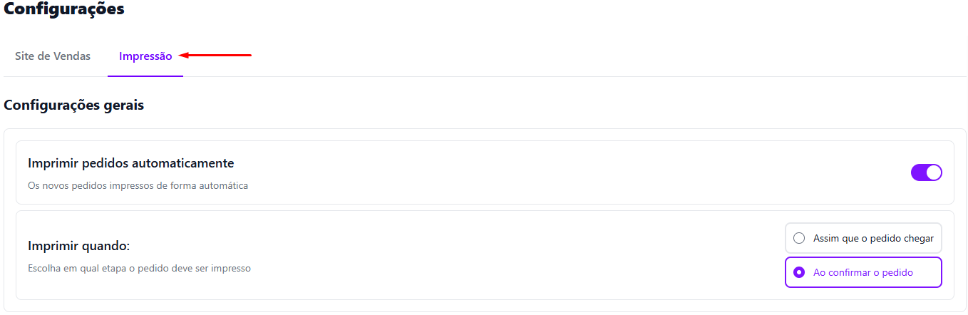 * Também é possível configurar para que a <mark style="color:purple;">**impressão**</mark> ocorra assim que o pedido chegar ou somente após confirmação.