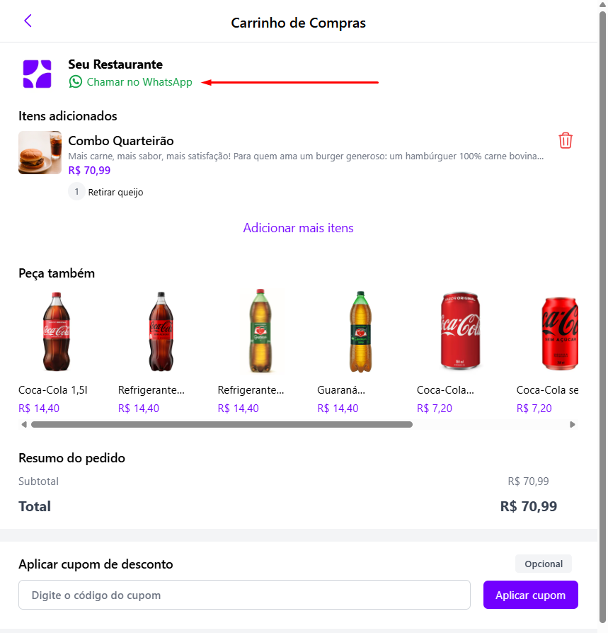 Mostra o botão de contato em várias áreas do site (carrinho, loja, acompanhamento).
