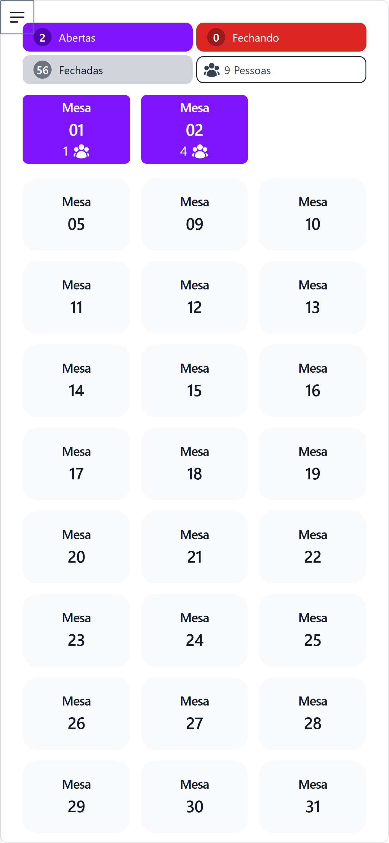 Depois de acessado irá mostrar as informações para o garçom referente as mesas.