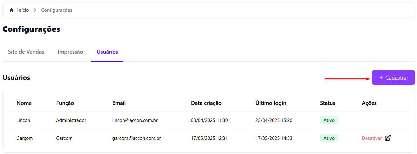 Agora, ficou mais fácil gerenciar quem pode acessar o seu estabelecimento dentro da plataforma! Com o menu <mark style="color:purple;">**Usuários**</mark>, você cadastra diferentes perfis com permissões específicas para cada função. Ideal para manter tudo organizado e sob controle! 🚀