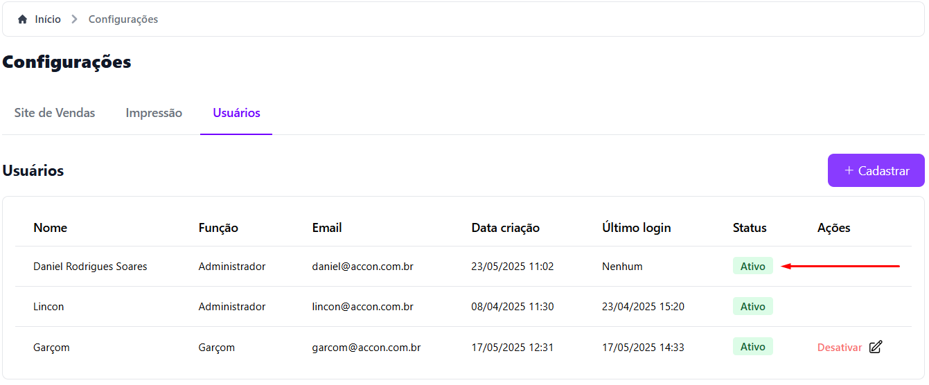 O novo usuário aparecerá imediatamente na lista inicial do menu **Usuários**, facilitando a visualização e a gestão da equipe! 💼✨
