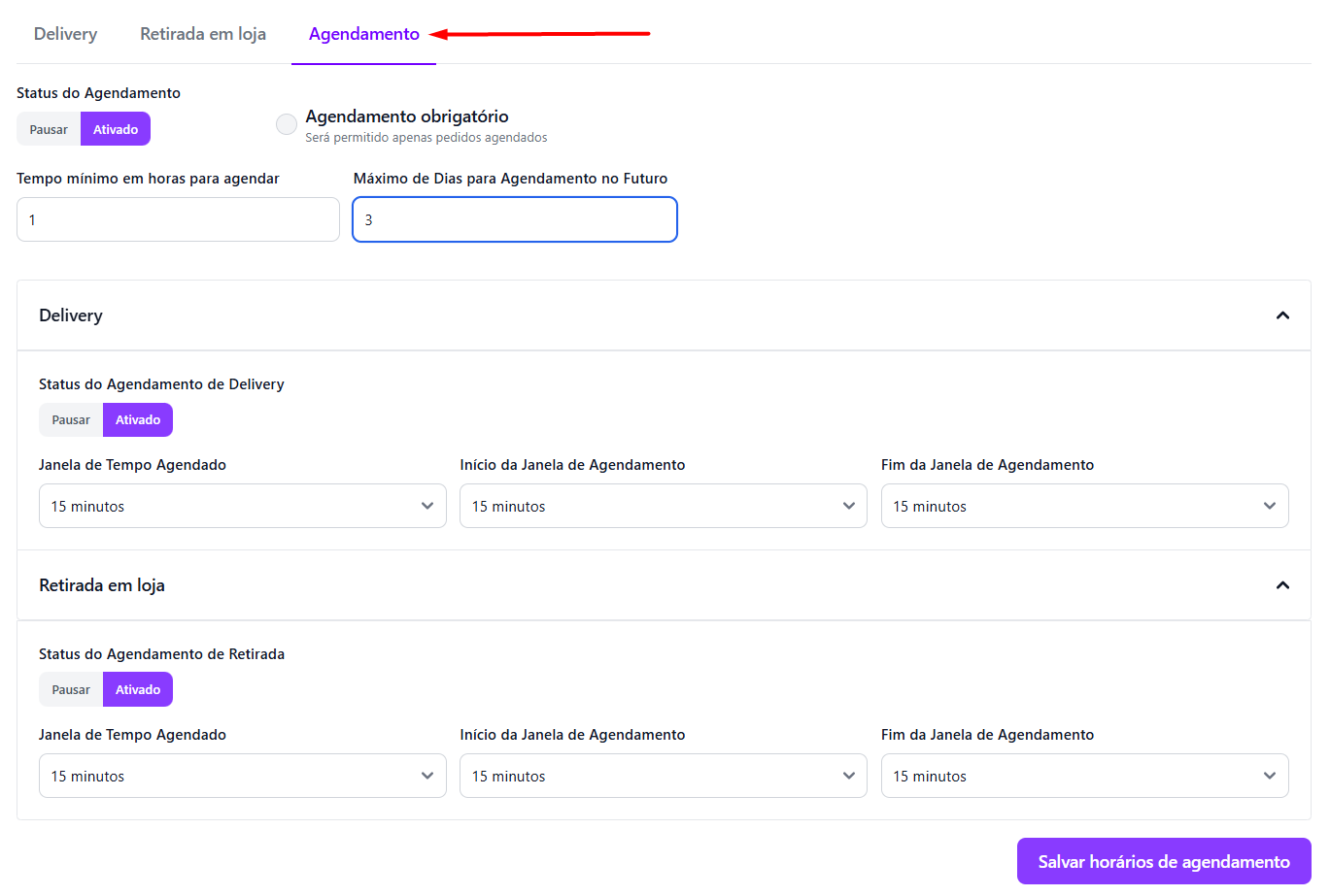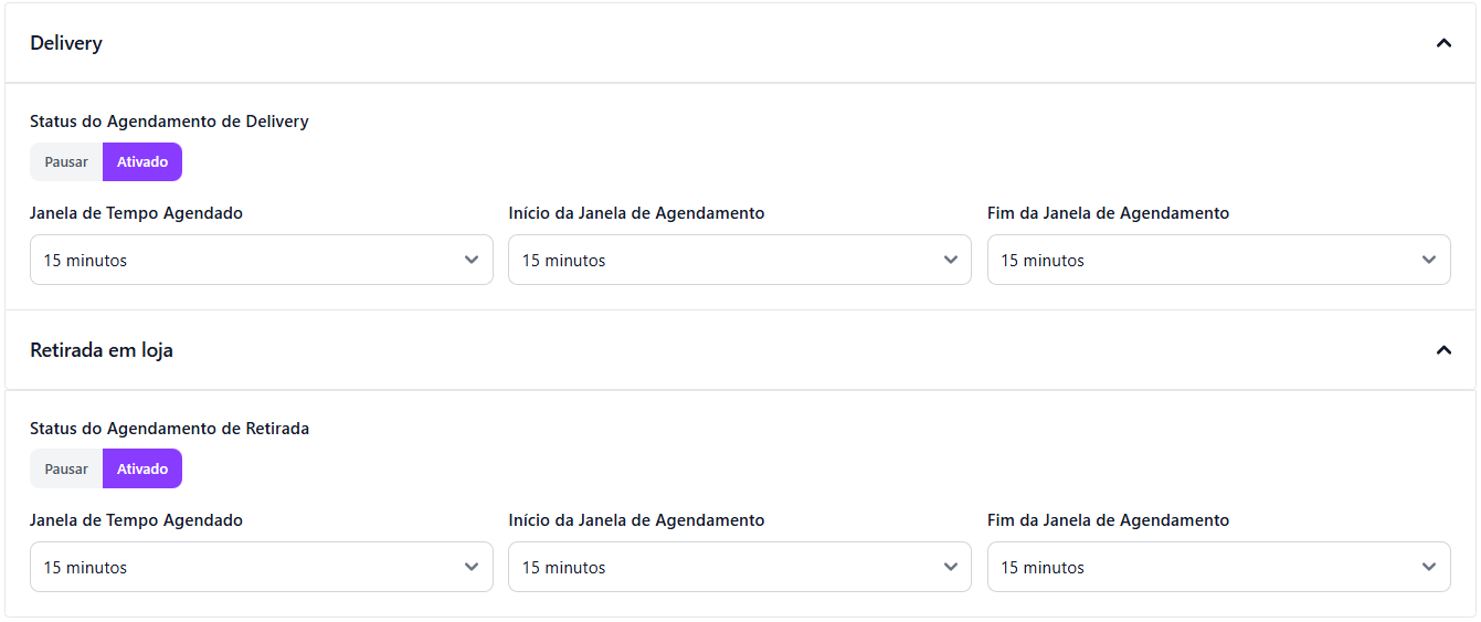 💡 Você pode escolher se deseja habilitar o agendamento apenas para Delivery, apenas para Retirada em Loja ou para ambos.