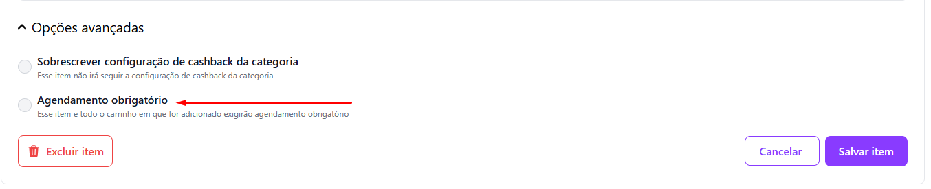 ⏰ Ative a opção **Agendamento obrigatório no item**