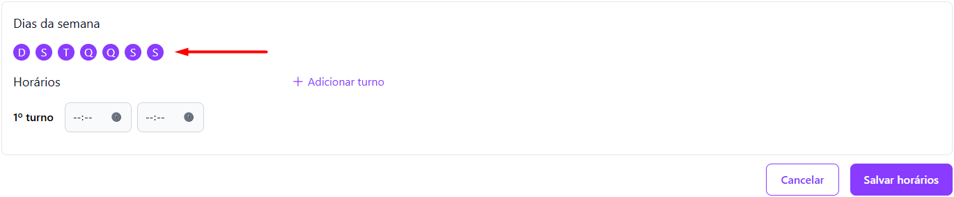 ✅ Após definir os horários, basta clicar em <mark style="color:purple;">**Salvar horários**</mark> para aplicar as configurações!