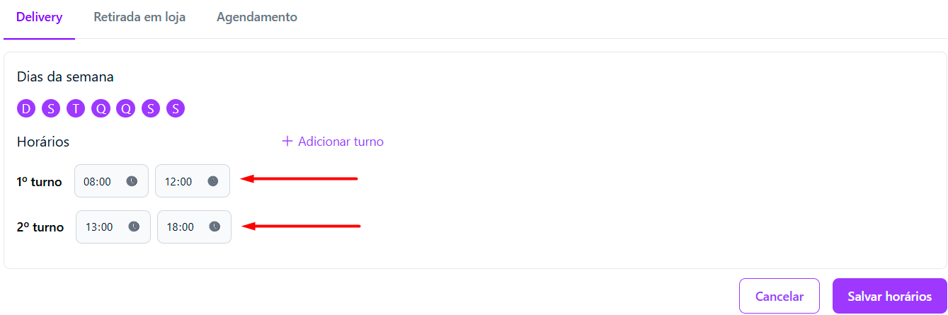 🔹 <mark style="color:purple;">**Exemplo de configuração:**</mark> Sua loja pode operar das <mark style="color:purple;">**08:00 às 12:00**</mark>, fazer uma pausa de <mark style="color:purple;">**1 hora**</mark> e retomar das <mark style="color:purple;">**13:00 às 18:00**</mark><mark style="color:purple;">.</mark>