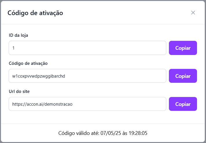 8️⃣ Copie os seguintes dados: 🔹 ID da loja 🔹 Código de ativação 🔹 URL do site