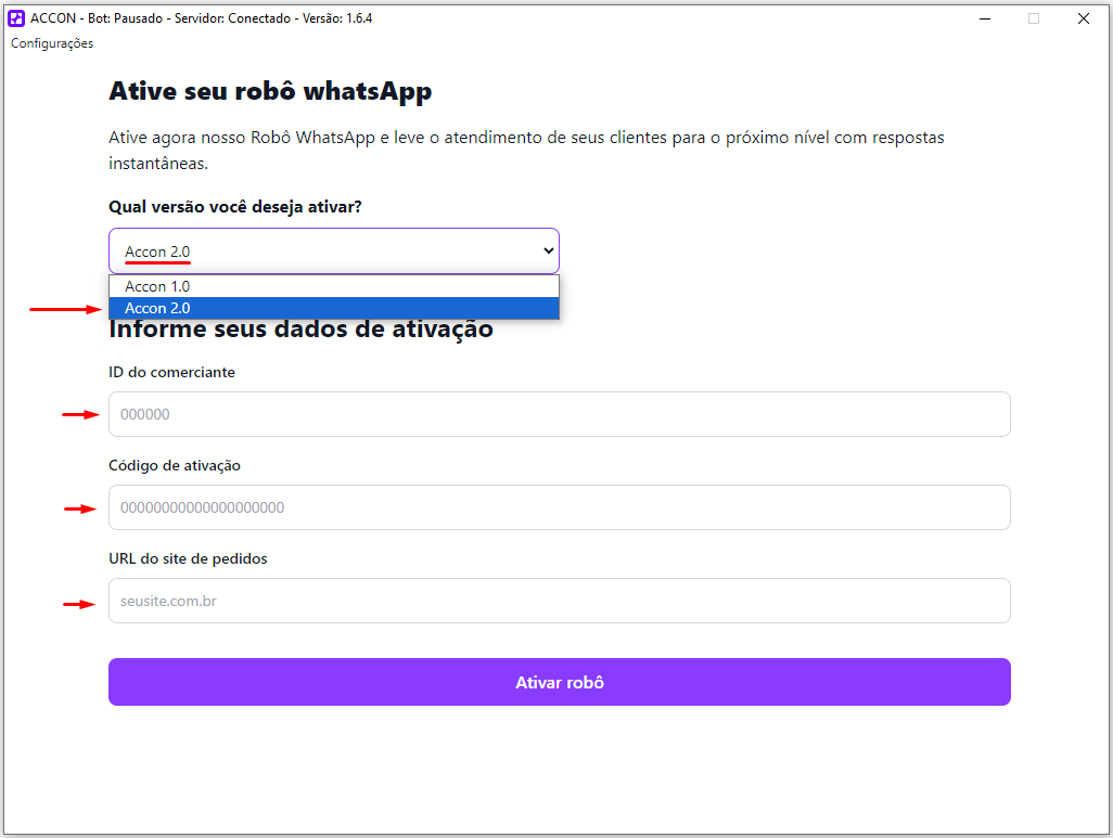 7️⃣ Acesse novamente o Portal Accon no menu Robô WhatsApp e gere os códigos de ativação.