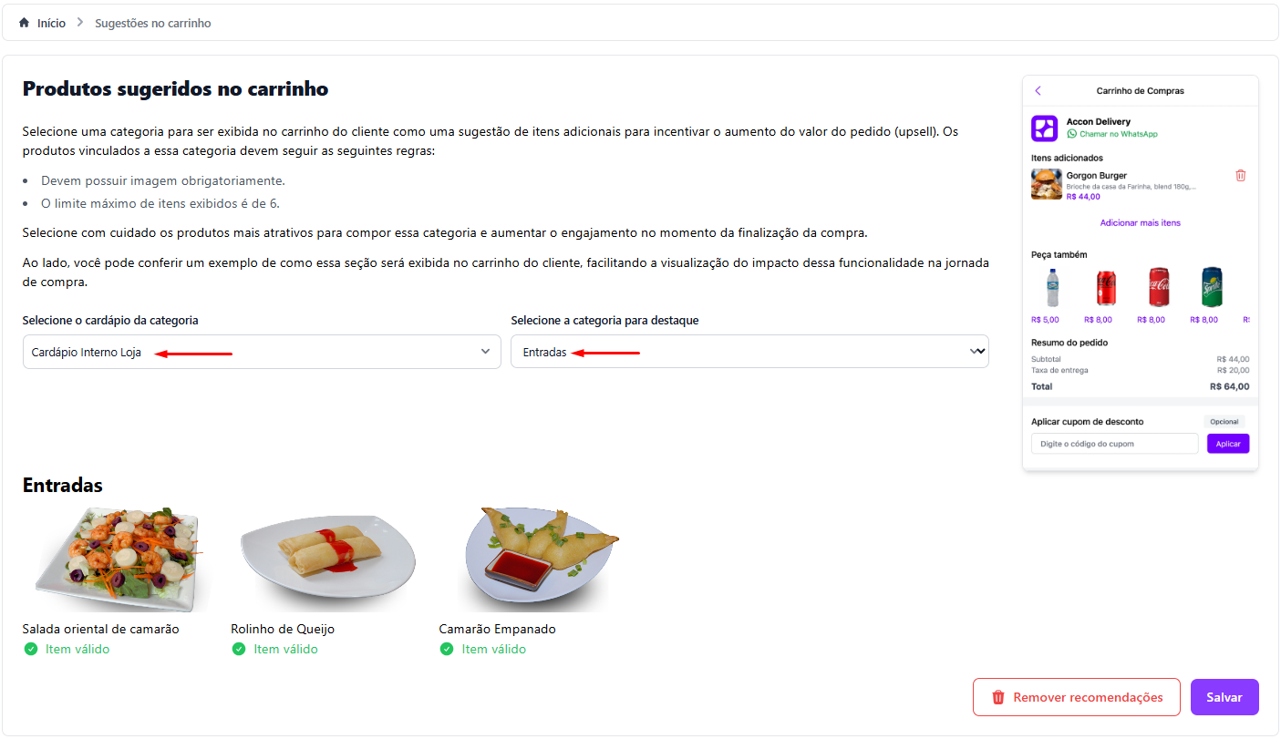 Neste menu, você pode configurar sugestões de produtos que aparecerão para o cliente logo após ele finalizar a escolha dos itens no carrinho. É uma ótima forma de incentivar compras adicionais! 🛒✨