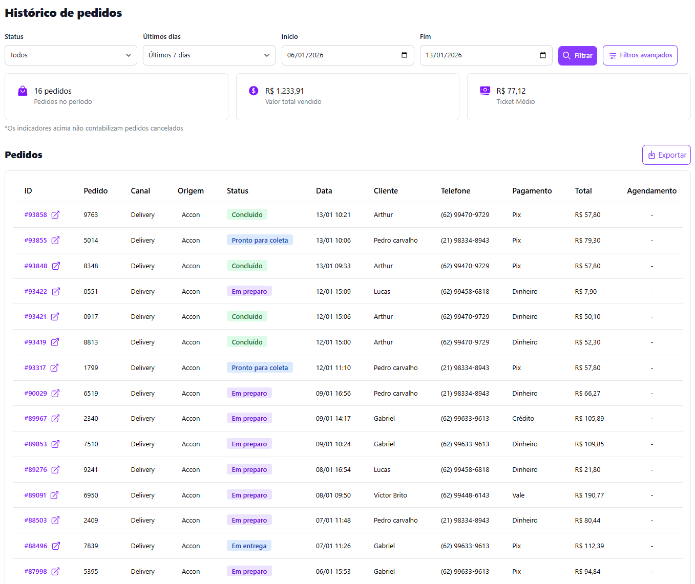 * 📌 **Status** → Separe pedidos por Concluído, Cancelado, etc.\