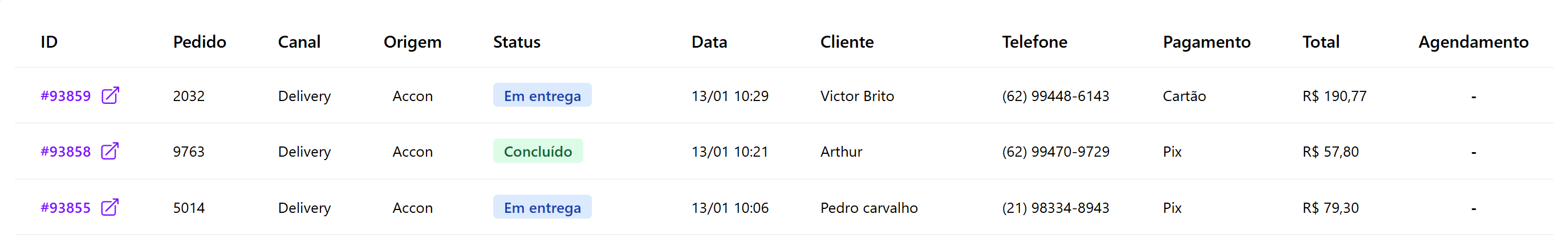 Caso o pedido tenha sido programado para uma data futura, a data e o horário selecionados são exibidos nesta coluna (exemplo: 09/12 às 10:00).