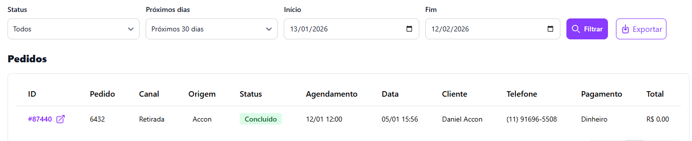 📌 Status → Filtrar por situação do pedido 📅 Período → Hoje, Amanhã, Próximos 7 dias, 30 dias ou datas personalizadas 📤 Exportar → Gerar relatório em CSV com os dados filtrados