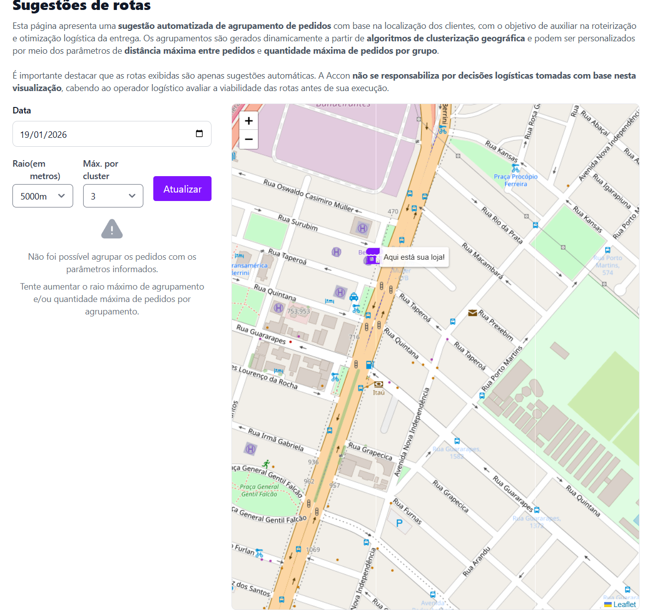 Às vezes, as regras que definimos (raio ou quantidade de pedidos) podem ser muito rígidas, impedindo que o sistema encontre uma rota eficiente.&#x20;