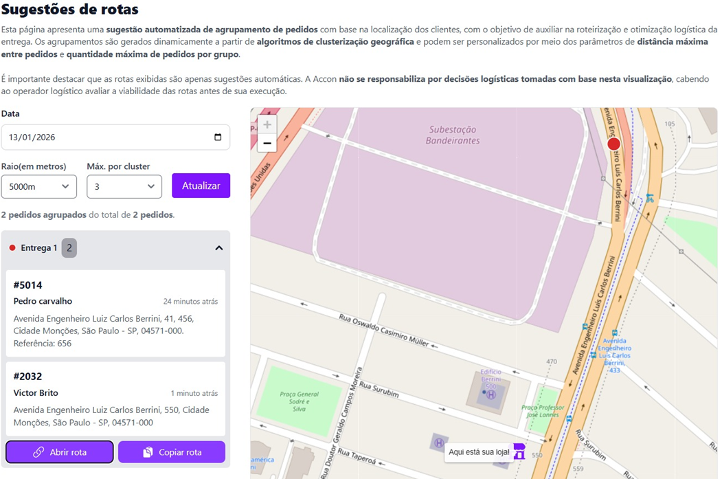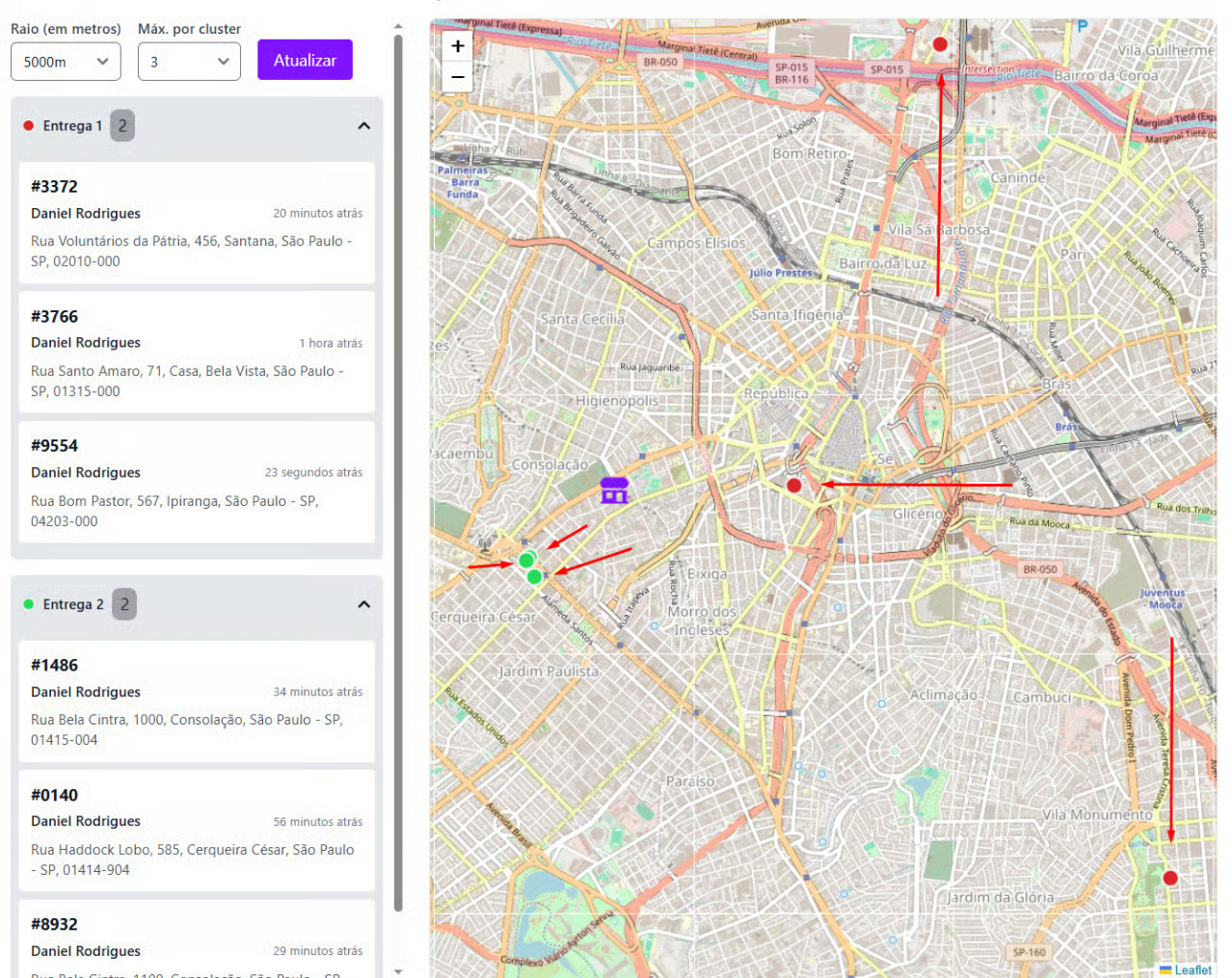 Em vez de enviar um entregador com apenas um pedido, a plataforma analisa o mapa e sugere entregas que podem ser feitas na mesma região.