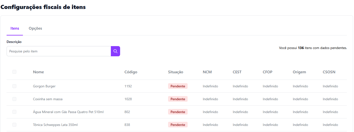 ⚠️ Itens com status Pendente precisam ser corrigidos para que possam ser utilizados na emissão de notas fiscais.
