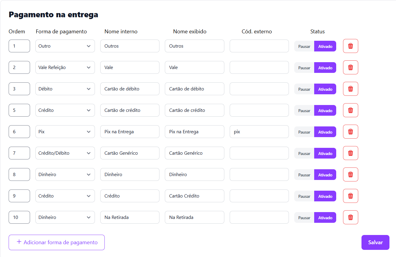 Nesta seção, você configura todas as formas de pagamento disponíveis no momento da entrega.