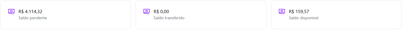 🔹 Saldo Pendente – Valores que ainda não foram liberados e estão aguardando o prazo de processamento. 🔹 Saldo Disponível – Valores já prontos para serem repassados (1 dia para Pix e 30 dias para Cartão de Crédito). 🔹 Saldo Transferido – Valores que já foram enviados para a sua conta bancária.