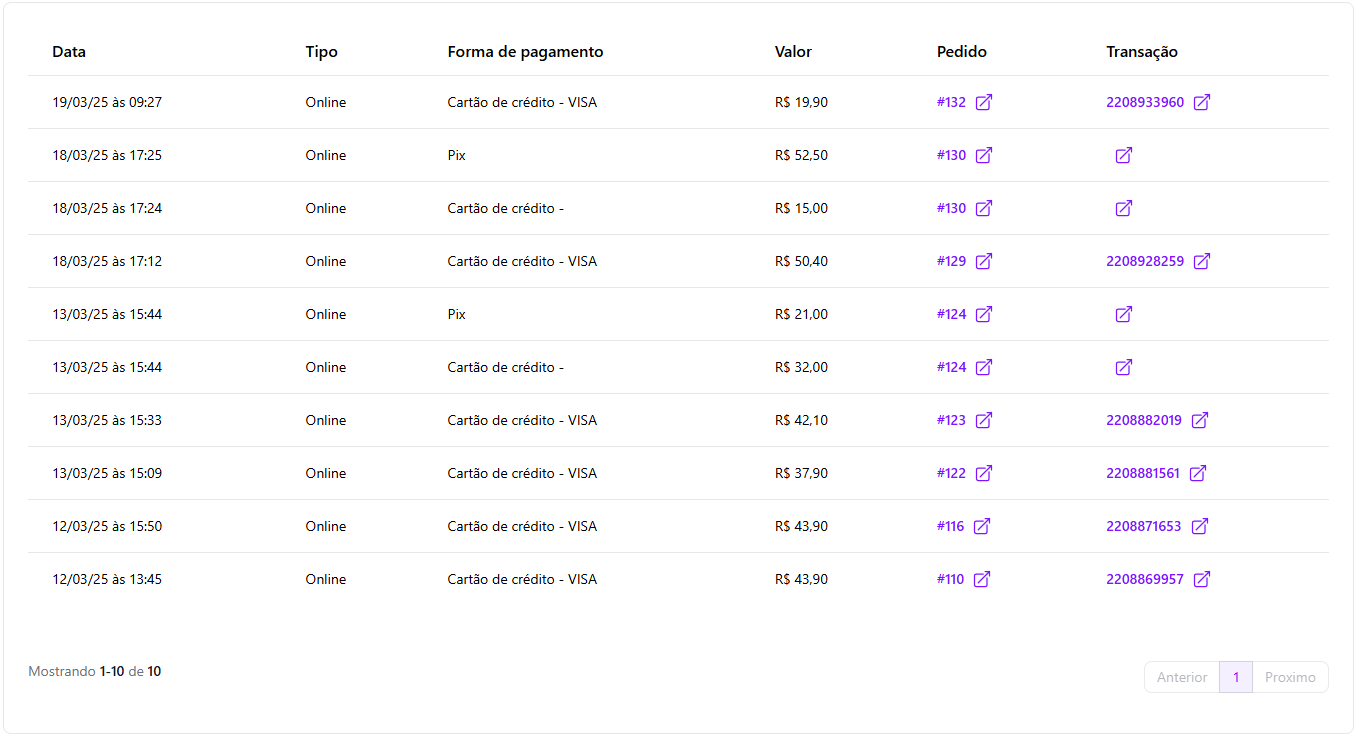 🔗 **Transação:** Apresenta o ID da transação para rastreamento no pagamento online.