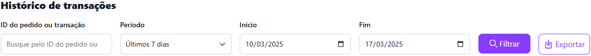 No <mark style="color:purple;">**Histórico de Transaçõe**</mark><mark style="color:purple;">**s**</mark>, você pode buscar rapidamente um pedido pelo <mark style="color:purple;">**ID do pedido**</mark> ou pelo <mark style="color:purple;">**número da transação**</mark>. Além disso, é possível filtrar por períodos pré-selecionados ou personalizar a busca inserindo <mark style="color:purple;">**data inicial e data final**</mark>.