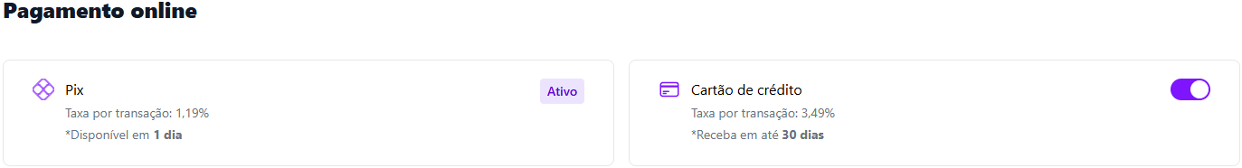 📌 **Importante!** O pagamento via <mark style="color:purple;">**Pix Online**</mark> é obrigatório, enquanto o pagamento com <mark style="color:purple;">**Cartão de Crédito**</mark> pode ser ativado ou desativado conforme sua preferência. Para isso, basta clicar no botão correspondente e ajustar a configuração com apenas um toque!