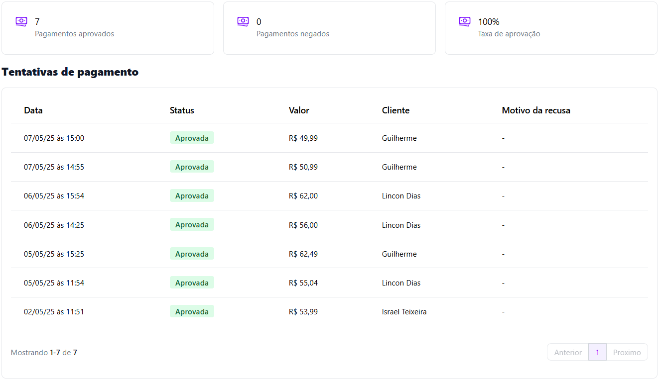 Neste menu, você pode visualizar todas as tentativas de pagamento feitas pelos seus clientes, além de acompanhar a taxa de aprovação da sua loja 💳✅