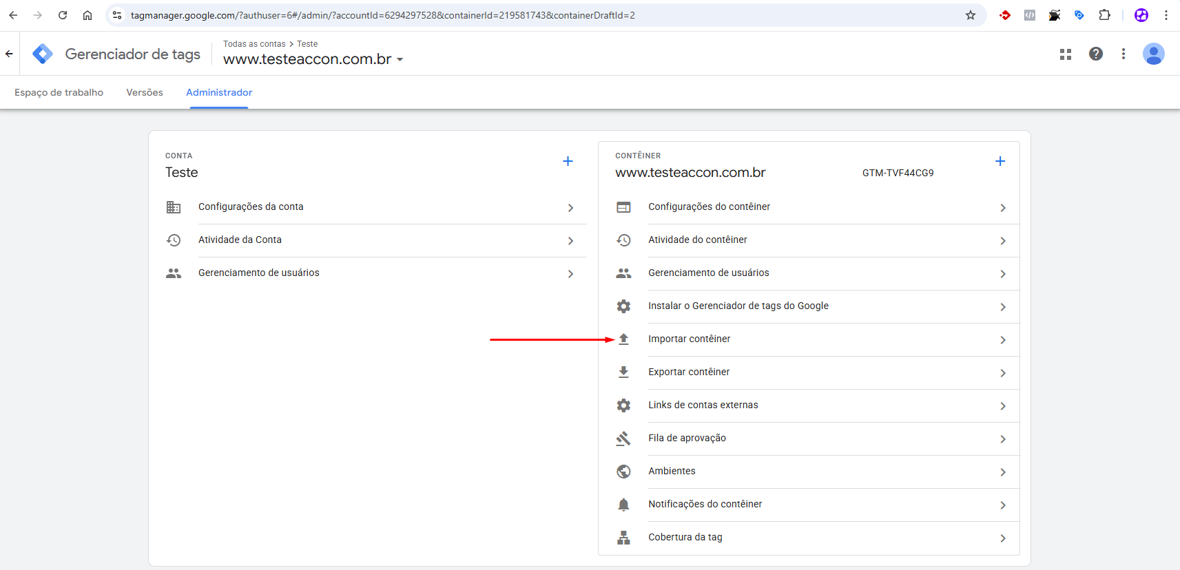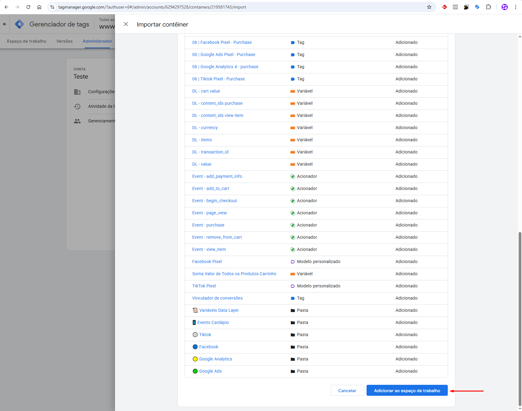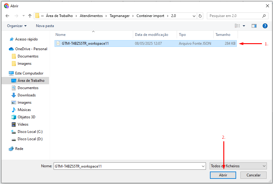 ● Faça o upload do arquivo GTM-T4BZS5TR\_workspace11.json (Este arquivo já contém todas as configurações iniciais das tags)