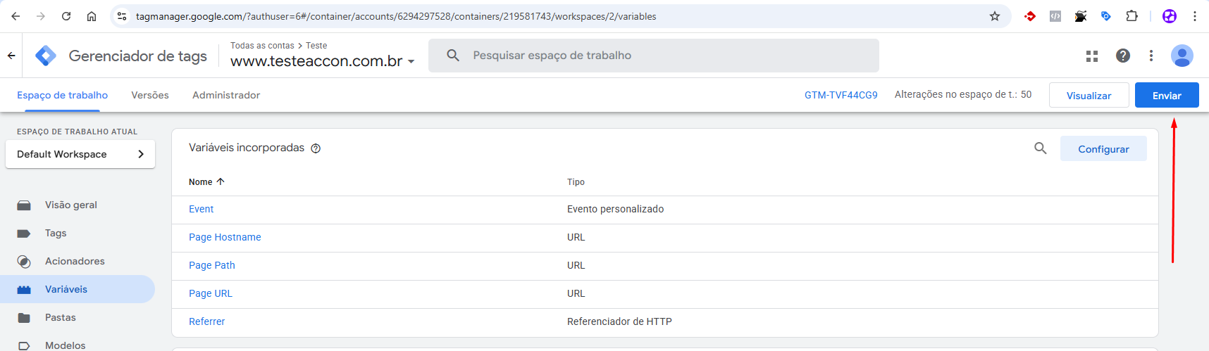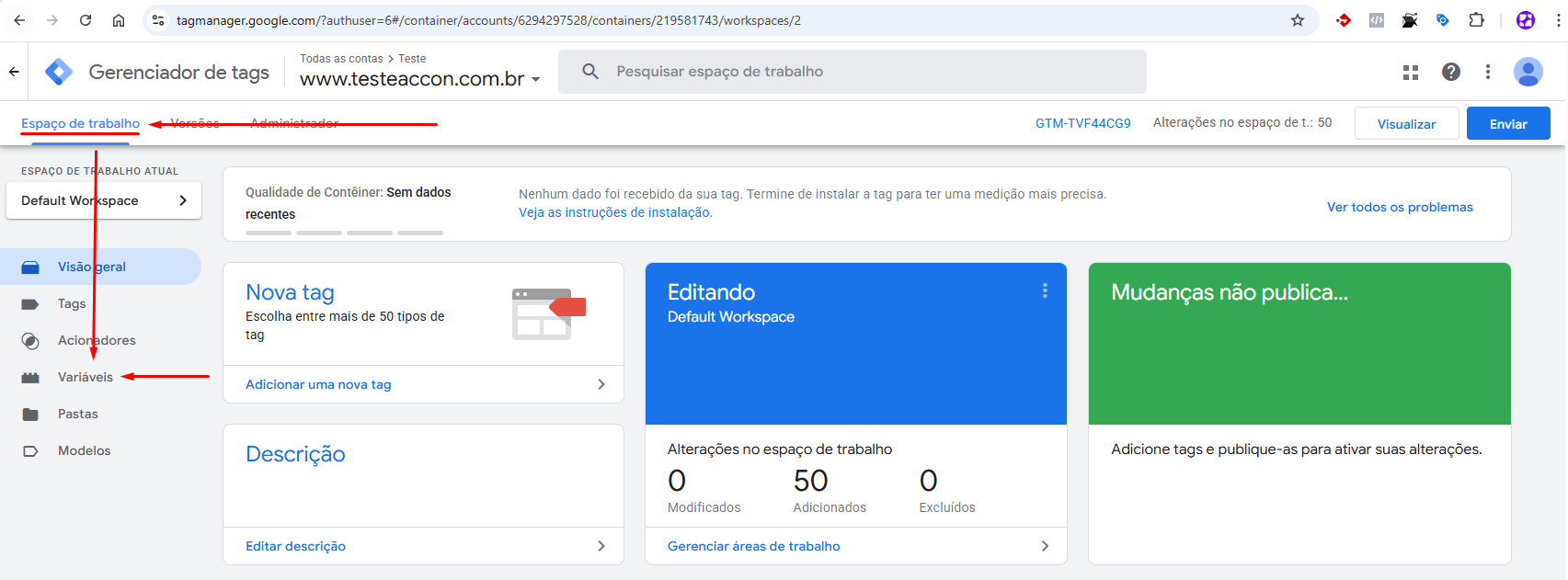 ● No <mark style="color:purple;">**Espaço de Trabalho**</mark> clique em <mark style="color:purple;">**Variáveis.**</mark>
