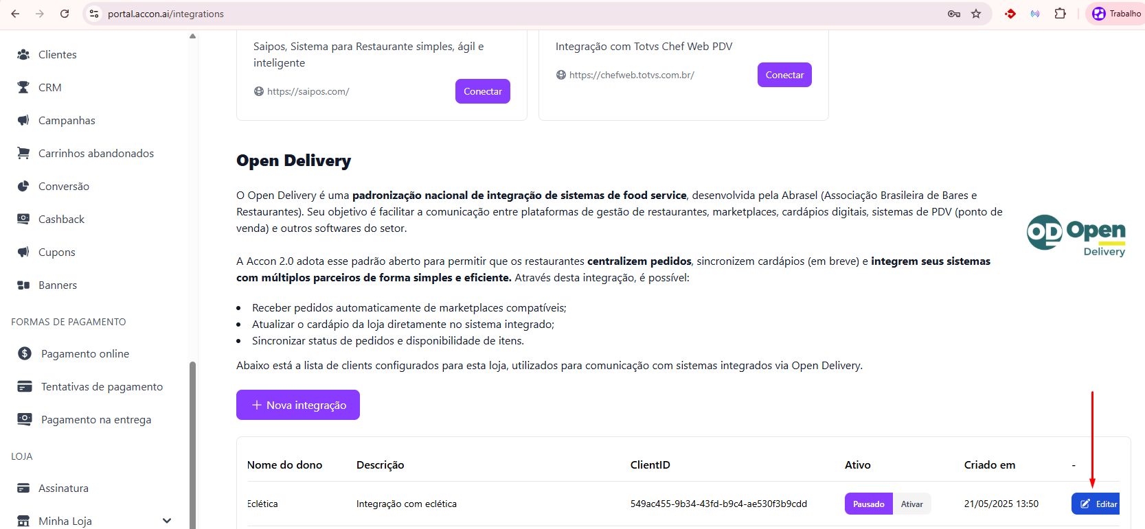 2️⃣ Vá até o final da página e clique em **Editar** ao lado da integração