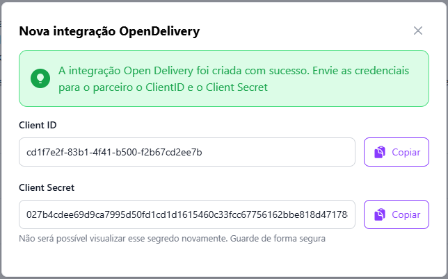 🔒 O **Client Secret** é exibido apenas no momento da criação da integração.