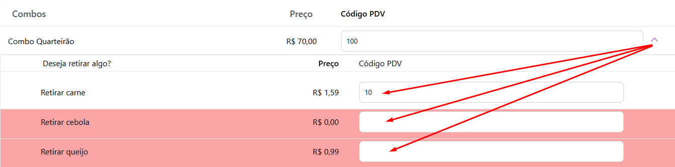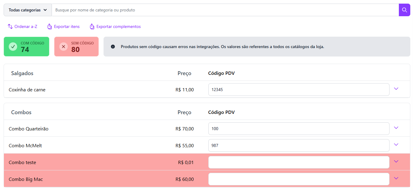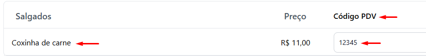 🔢 Ao lado de cada item, haverá um campo para inserir o **código PDV correspondente da Saipos**