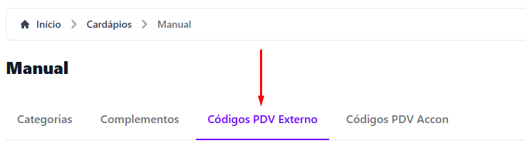 3️⃣ Clique na opção **Códigos PDV Externo**