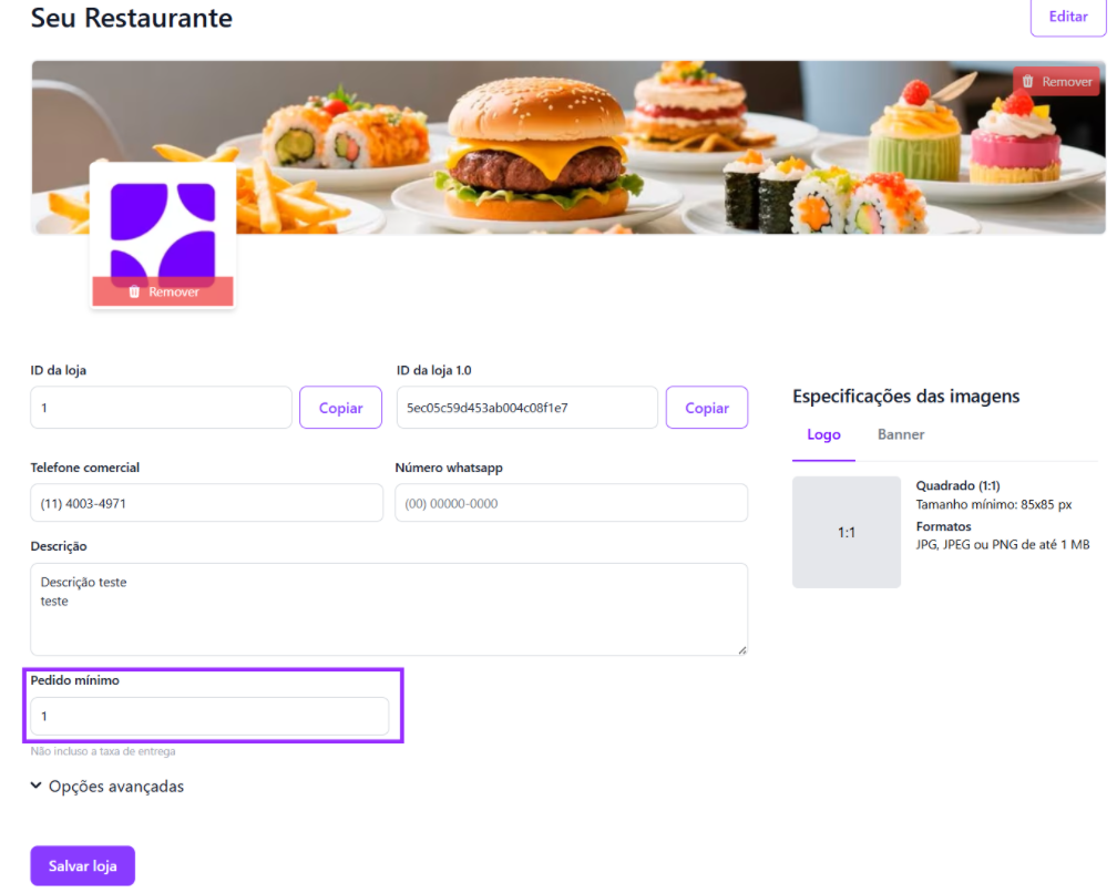 Se você definir o pedido mínimo como R$ 30,00, o cliente precisa escolher comidas e bebidas que somem, no mínimo, esse valor.