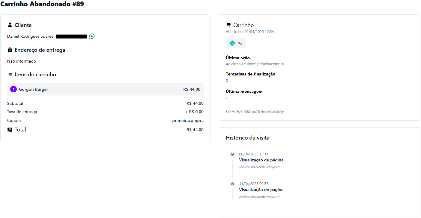 📅 Abandonado em: Data e hora em que o cliente fechou o cardápio sem concluir a compra.