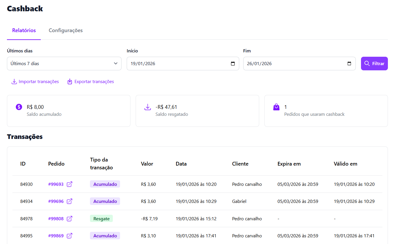 🧾 Pedidos com cashback Apresenta os pedidos que receberam ou utilizaram crédito de cashback.