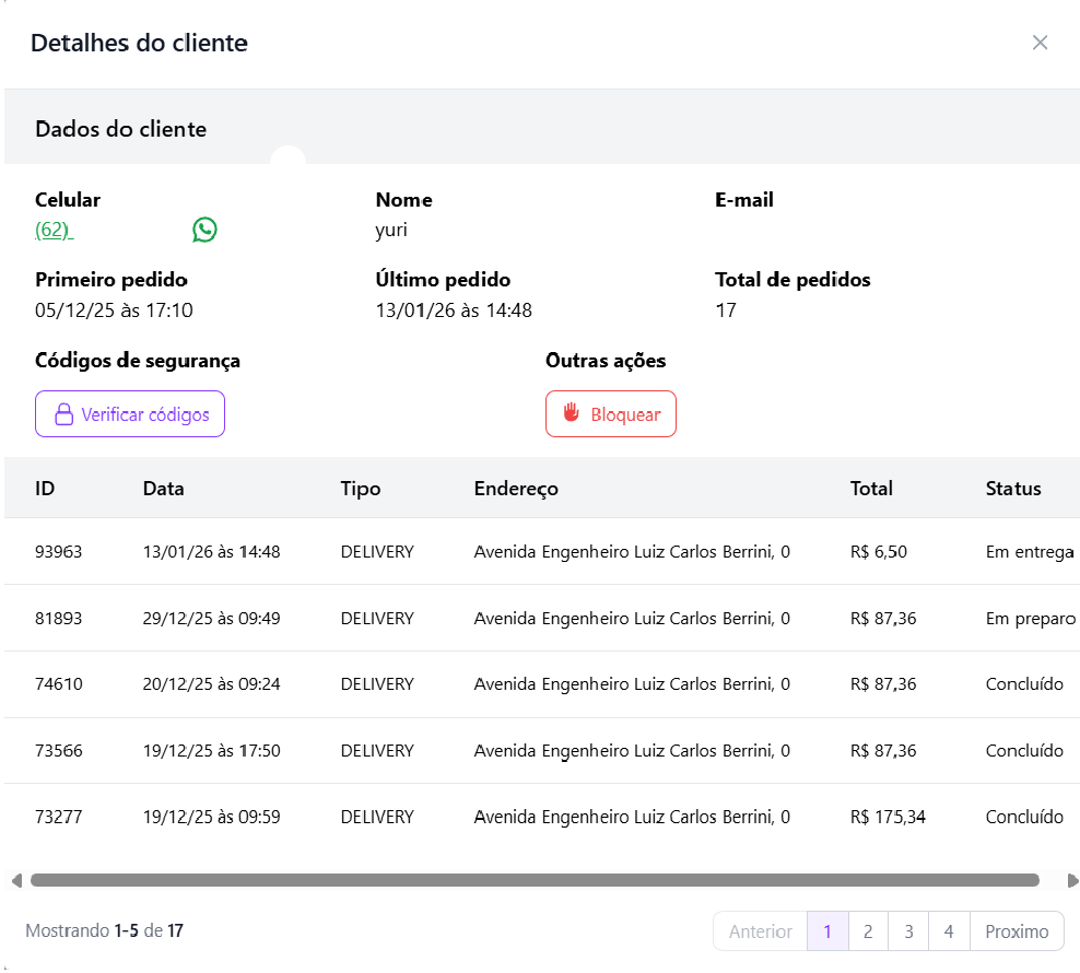 Ao clicar em “Ver detalhes”, é possível acessar o histórico completo do cliente, incluindo: