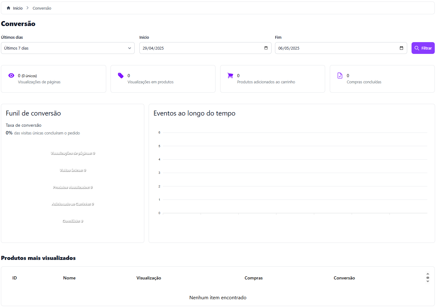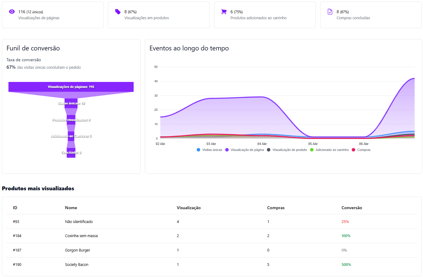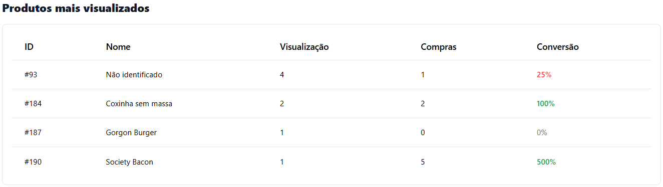 * **🔥 Produtos mais visualizados:** Exibe os produtos mais acessados, o número de compras realizadas e a <mark style="color:purple;">**% de conversão**</mark> de cada um.